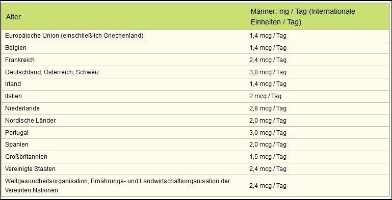 Die Rate der Vitamin-B12-Aufnahme wird von den Ernährungskomitees in jedem Land bestimmt und liegt zwischen 1 und 3 Mikrogramm pro Tag. Die vom US-amerikanischen Food and Nutrition Board im Jahr 1998 festgelegte Norm lautet beispielsweise