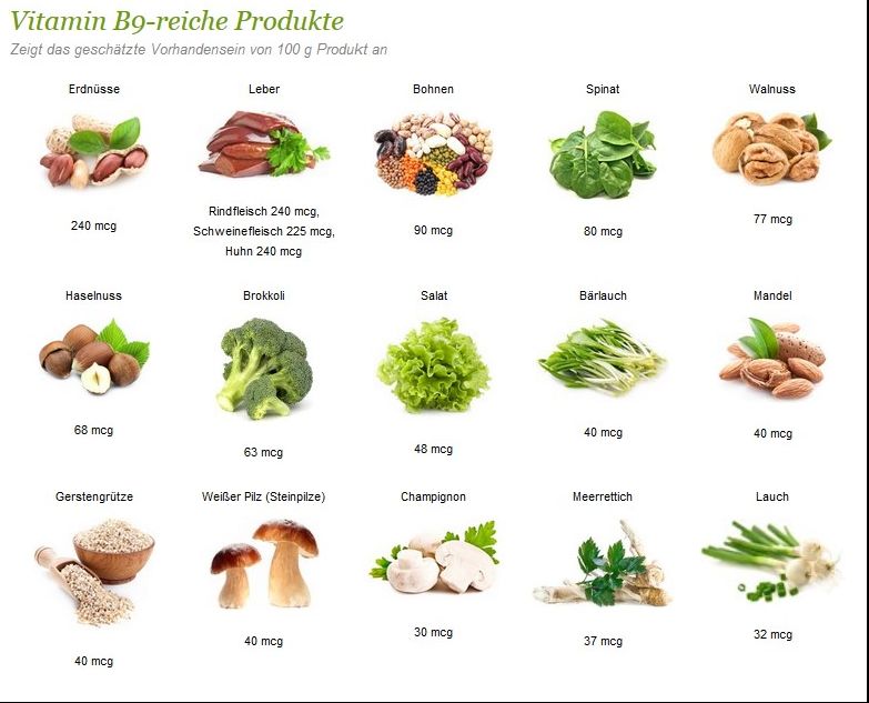 Dieses Vitamin ist für den Körper notwendig, um neue Zellen (Haut, Haare, Blut usw.) zu bilden. Vitamin B9 hat einen wohltätigen Effekt auf den Fettstoffwechsel in der Leber, den Austausch von Cholesterin, Cholin und bestimmten Vitaminen. Es verbessert den Appetit und verleiht der Haut ein gesundes Aussehen.
